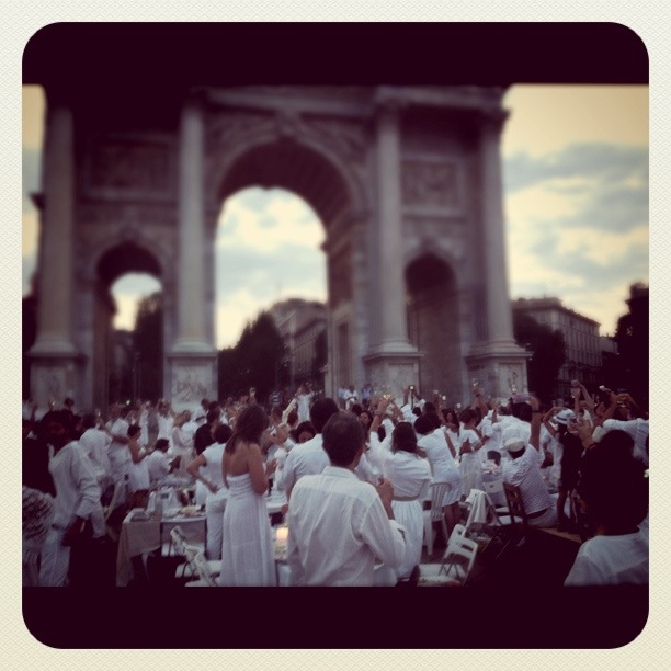 Un’atmosfera candidamente surreale, centinaia di persone che naturalmente si ritrovano sotto un arco per brindare insieme e condividere un momento di bellezza. Un bianco puro di quelli che sanno di tovaglie di fiandra della nonna e antichi ricordi. Un flash mob, ovvero un movimento che nasce spontaneamente, ieri sera ha portato a riunirsi, sulla scia di quanto già accaduto a Parigi, Torino , sotto l’Arco della Pace di Milano.Una location per nulla scontata e piuttosto suggestiva.