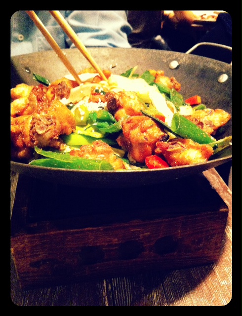 Ordiniamo gamberi fritti sale e pepe davvero buonissimi e leggeri: uno tira l’altro e in circa 30 secondi sono finiti, nonostante la porzione più che abbondante. Ordino tagliatelle di riso alle verdure e qui ho avuto la soddisfazione che cercavo: le tagliatelle che adoravo quando ero ad Hong Kong e mi sbafavo ogni giorno a pranzo! Consistenza perfetta, gusto inimitabile, germogli di soia e verdurine sparse. Quello che cercavo. Ormai i vestiti sono un tutt’uno con il profumino del locale, quindi, perché non provare anche noi la tanto proclamata Pentola di Fuoco?? Optiamo per quella con il pollo. E qui i pareri si dividono. A mio avviso davvero buonissima, però vi avverto che i pezzi di pollo sono pieni di ossicini da sputacchiare nel piatto in vero Chinese style! Il tutto mi ha ricordato la Cina vera, più autentica, ma per gli Italiani che non sono abituati a mangiarsi anche le ossa (menomale) capisco che non sia il massimo. Per me è stata un’esperienza molto positiva e consiglio il posto a chi abbia voglia di mangiare del cibo cinese fatto a regola d’arte. Ottimi anche i dumpling, i ravioli al vapore che sono cucinati e portati in tavola com’è giusto che sia! Miao!