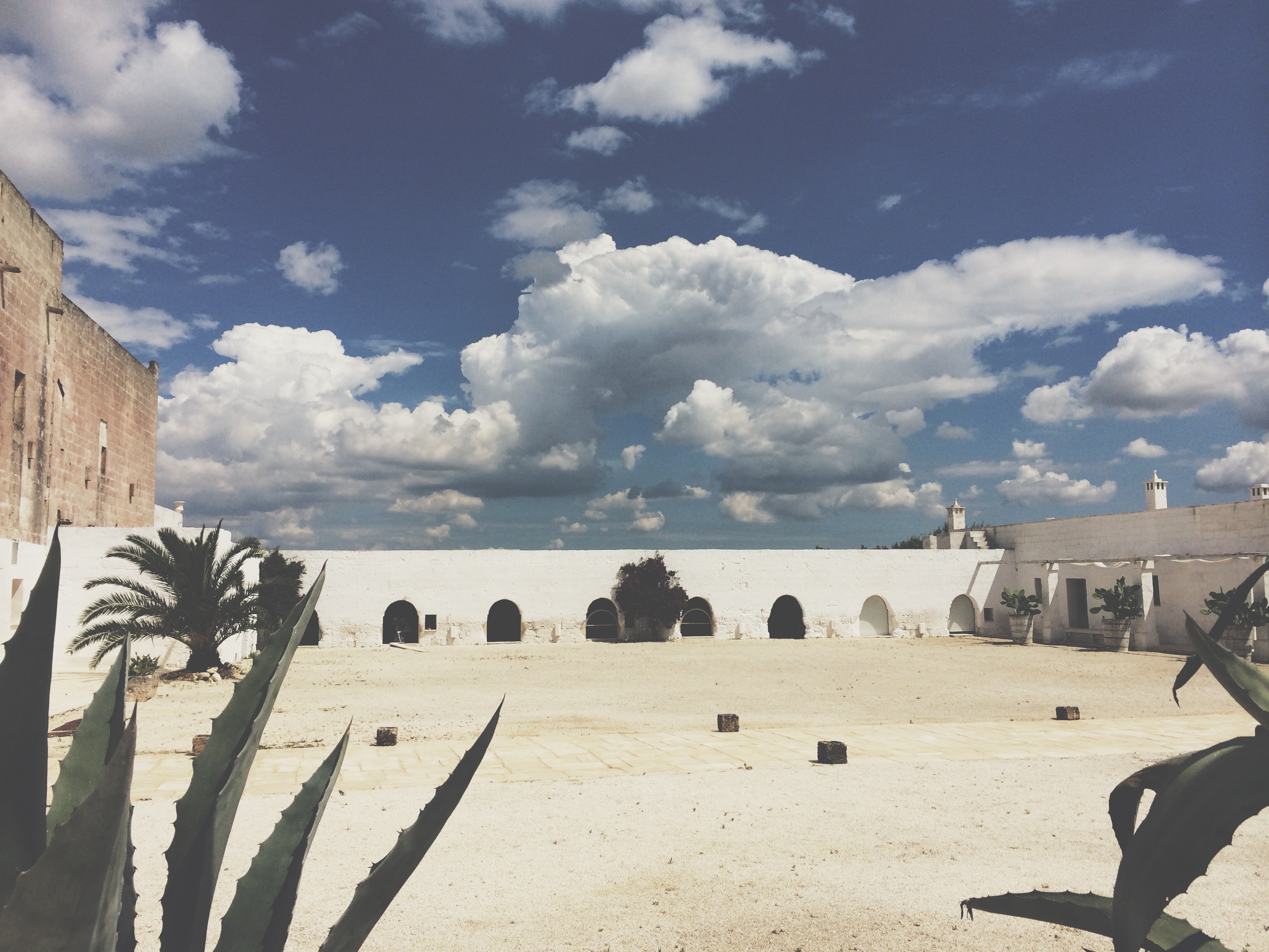 Esco e mi ritrovo di fronte ad un paradiso. La corte bianca, abbagliante, il cielo azzurro pieno di nuvole. Da qui inizia il viaggio di Ragoût alla scoperta della Masseria Potenti.