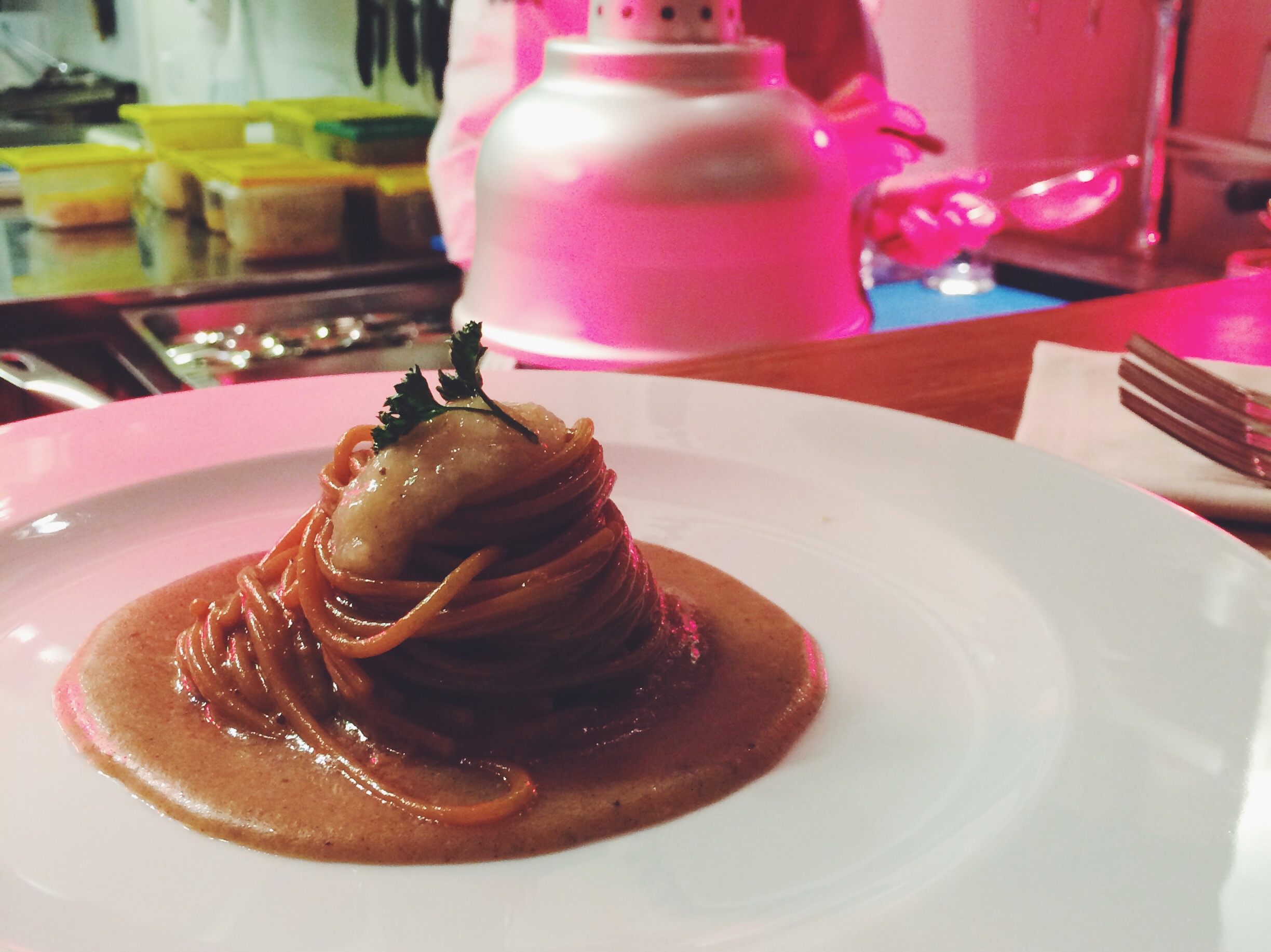 Abbiamo assaggiato uno dei piatti proposti dal menù in abbinamento a Birra Moretti, i suoi Spaghetti di kamut con crema di pane bruciato, tartare di scampi, bergamotto ed erba cedrina. Davvero unici.