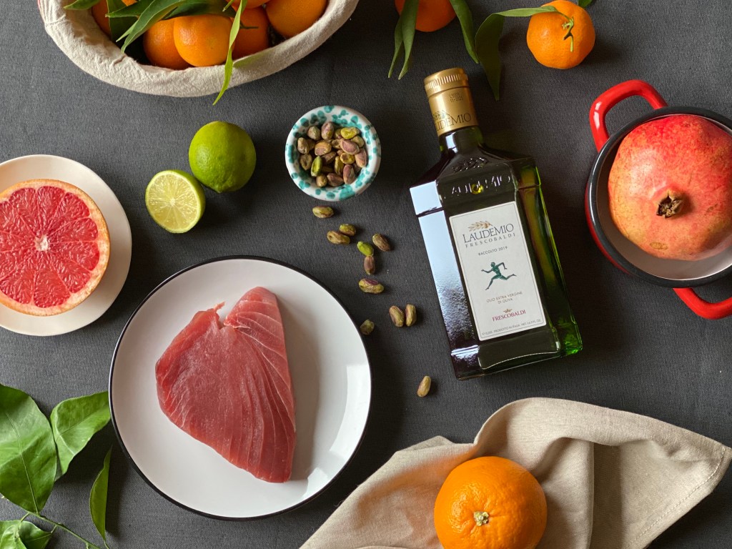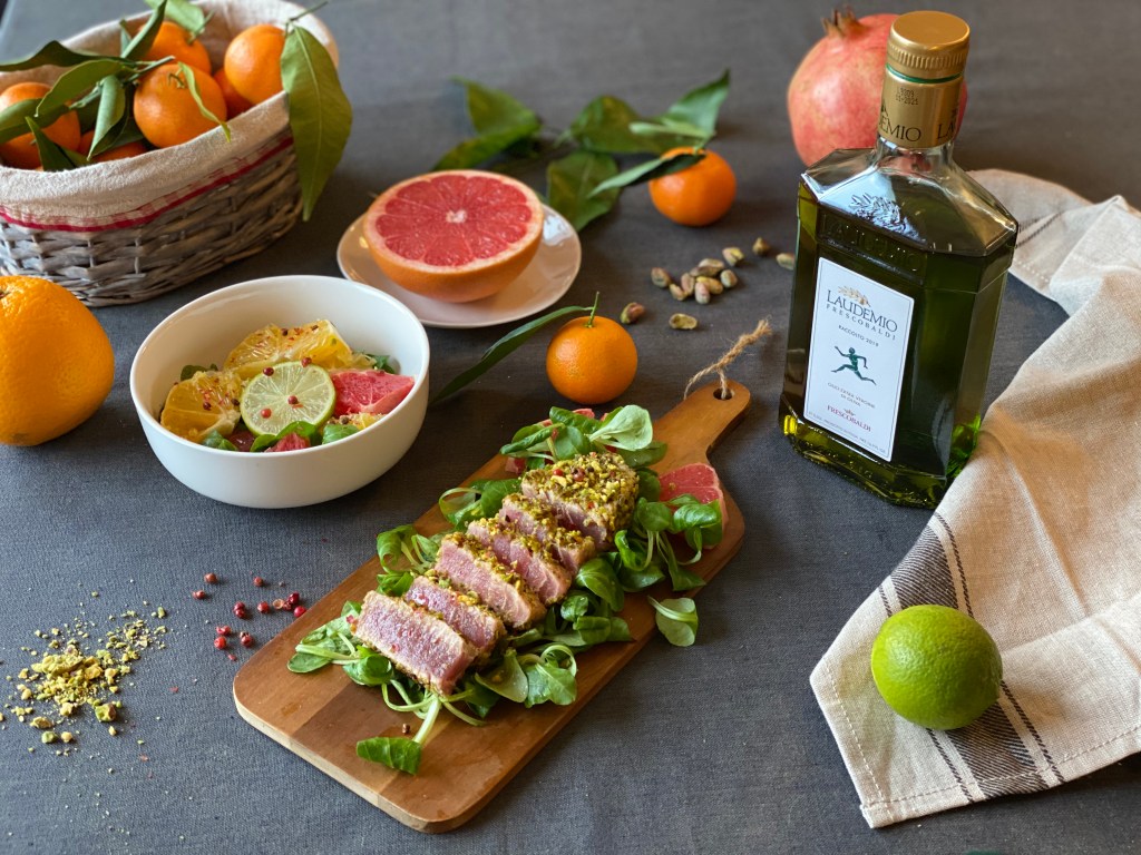 Ricetta di Tonno tataki ai pistacchi con insalatina di agrumi al Laudemio Frescobaldi